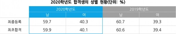 성비 격차도 다소 완화됐다. 2019학년도 최종 등록한 남학생은 60.7%, 여학생은 39.3%였으나, 2020학년도 최종 등록한 남학생은 59.7%, 여학생은 40.3%로 집계됐다. 남학생은 1% 줄고, 여학생은 1% 증가했다.