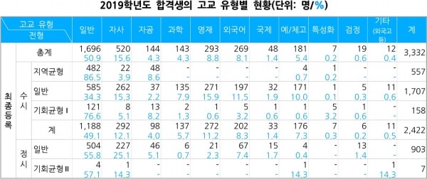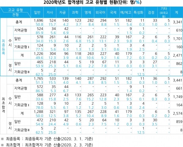 합격생들의 고교 유형에서는 과학고와 영재고 출신 감소와 외국어고의 약진이 눈에 띈다. 일반고 출신은 지난해와 동일하게 1,696명이 합격했으며, 자사고의 경우 2019학년도 520명에서 524명으로 0.1%p 증가했다. 과학고 출신은 143명에서 123명으로 20명(-0.6%p) 줄었으며, 영재고는 293명에서 282명으로 11명(-0.4%p) 줄었다. 반면 외국어고의 경우 지난해 269명이 합격했으나 올해는 294명으로 25명(0.7%p) 늘었다.