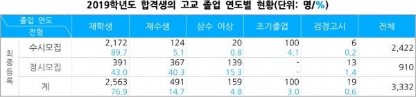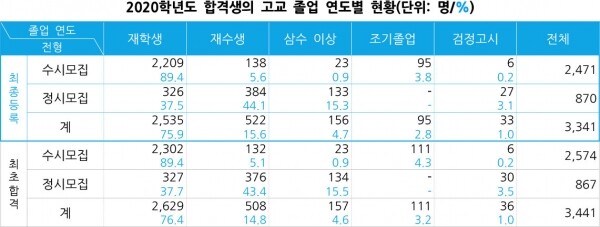 N수생 합격 비율도 전년 대비 높아졌다. 올해 재학생 합격자는 2,535명(75.9%)으로 지난해 재학생 합격자 2,563명(76.9%) 보다 28명 줄었으며, N수생은 678명(20.3%)으로 지난해(650명, 19.5%) 보다 28명 늘었다.