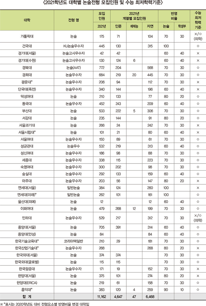 [대학저널] 2021학년도 수시 논술전형을 실시하는 대학은 33개교로 1만 1,162명을 선발하게 된다. 2021학년도 논술전형의 주요 변화 사항 중 눈에 띄는 점 몇 가지를 짚어보고 논술전형 지원전략을 안내한다.