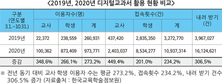 특히 올해는 코로나19에 따른 비대면 수업 확대로 디지털교과서의 내려 받기 건수가 전년 대비 약 3배 이상 증가했다.