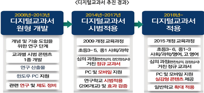 디지털교과서는 교과 내용에 다중매체(멀티미디어) 자료, 평가 문항, 보충·심화 학습 자료, 용어 사전 등 다양한 학습 자료와 학습 지원 및 관리 기능을 제공하는 교과용 도서로 2014년 연구학교 대상으로 시범 적용을 거쳐 2018년부터 일반학교까지 확대 적용되고 있다.