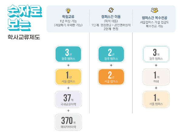 동국대 경주캠퍼스는 서울캠퍼스와의 활발한 캠퍼스간 교류도 강점을 보이고 있다. 서울캠퍼스로 전과할 수 있는 캠퍼스간 이동(전과) 제도를 비롯해 1년 동안 서울캠퍼스에서 학점 취득이 가능한 캠퍼스간 학점교류 제도, 서울캠퍼스에서 추가로 전공 취득이 가능한 캠퍼스간 복수전공 제도 등 다양한 캠퍼스간 학사교류제도를 활용할 수 있다.