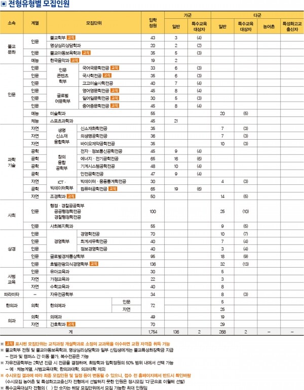 ‘가’군에는 ▲불교문화대학 ▲인문대학 ▲과학기술대학(공학계열) ▲한국음악과 ▲스포츠과학과를 모집하며, ‘다’군에는 △사회대학 △상경대학 △자유전공학부 △과학기술대학(자연계열) △사범교육대학 △한의예과(인문·자연) △의예과 △간호학과 △미술학과를 모집한다.