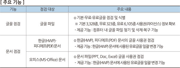 프로그램은 약 1만여건의 기본·무료·유료글꼴 정보를 수집해, 컴퓨터 내에 설치된 글꼴 파일과 문서파일(HWP, PDF, PPT)을 쉽게 점검할 수 있도록 개발됐다.