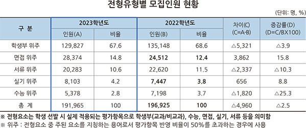 면접 위주와 실기 위주는 전년보다 선발 인원이 증가했으며, 수능 위주와 서류 위주, 학생부 위주 등의 선발인원은 감소한 것으로 나타났다.