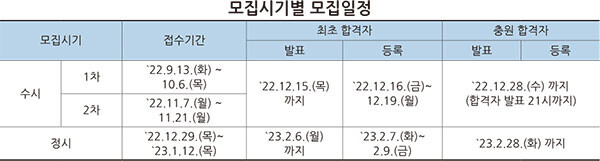 입학전형 시행계획은 ‘2023학년도 전문대학 입학전형 기본사항’의 기본방향과 내용을 준수하는 범위 내에서 각 대학이 자율적으로 수립했다.