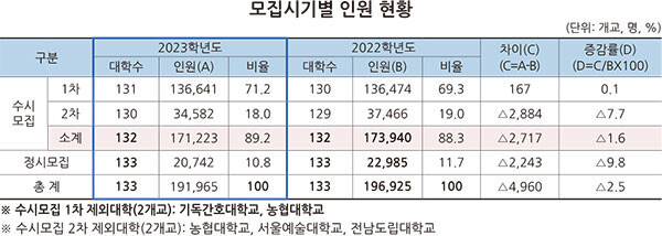 시행계획에 따르면 전문대는 2023학년도 입시에서 19만1964명을 모집한다. 이는 2022학년도 (19만6925명)보다 4960명(-2.5%) 감소한 것이다.