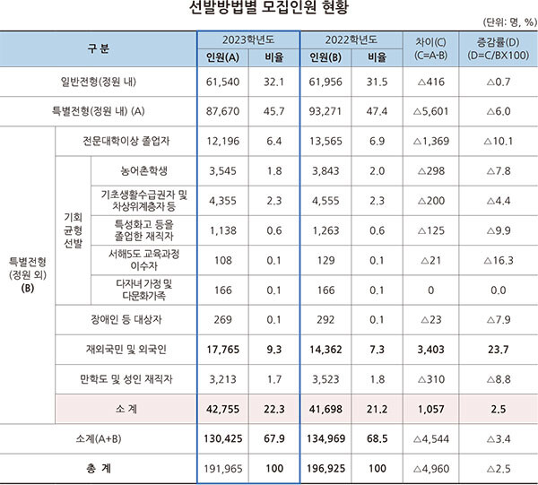 일반전형(정원 내)은 전년보다 416명이 감소한 6만1540명을, 정원 내 특별전형은 전년보다 5601명이 감소한 8만7670명을 선발한다. 정원 외 특별전형은 전년보다 1057명이 증가한 4만2755명을 각각 선발한다. 특히, 재외국민‧외국인 전형은 전년보다 3403명 증가한 1만7765명을 선발한다.