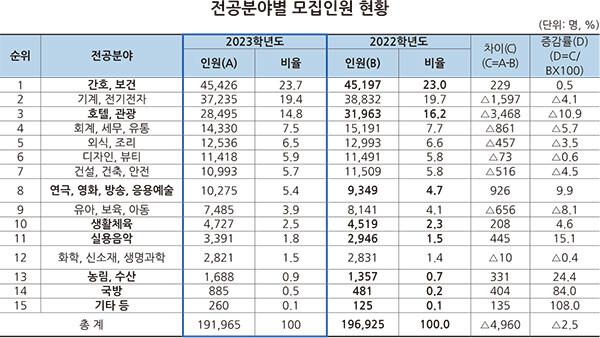 전공별로는 ‘간호‧보건’ 분야 모집인원이 4만5426명(23.7%)으로 가장 많다. 이어 ‘기계‧전기전자’, ‘호텔‧관광’, ‘회계‧세무‧유통’ 순으로 선발한다.