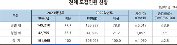 정원 내 모집인원은 14만9210명(전체 모집인원의 77.7%)으로 전년 대비 6017명(-3.9%) 감소했으며, 정원 외 모집인원은 4만2755명(전체 모집인원의 22.3%)으로 전년 대비 1057명 증가했다.