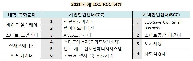 아주대는 지역사회 수요와 대학의 강점 분야를 고려한 4대 특화분야(바이오·헬스케어, 스마트모빌리티, 신재생에너지, AI·빅데이터)를 설정하고, 이를 선도할 기업협업센터(ICC)와 지역협업센터(RCC)를 구축해 지역사회(산업) 협력 프로그램을 종합적으로 추진하고 있다. 대학의 특성화 분야를 중심으로 산학협력 역량을 집중해 기업·지자체와 함께 인재육성, 기술개발·사업화, 리빙랩 프로젝트 진행 등 실질적인 성과를 이끌어내고 있다.