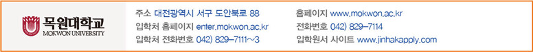 학생부종합전형은 수험생의 제출서류에 대한 부담을 해소하기 위해 교사추천서 및 자기소개서 제출을 전면 폐지했으며 학생부교과전형과 동일하게 면접고사 5일 전에 입학홈페이지(http://enter.mokwon.ac.kr)에 면접문항을 사전 공지함으로써 수험생들에게 면접에 대한 준비와 전략을 지원하고 있다.