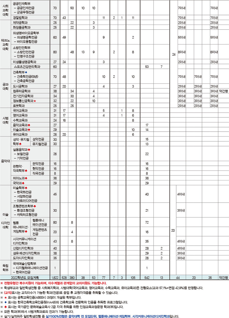 2022학년도 수시모집 학생부교과 전형으로는 일반학생, 일반학생(교과), 일반학생(교과면접), 지역인재(교과), 지역인재, 사회기여자, 고른기회전형이 있다. 학생부교과전형 중 신설된 전형으로는 일반학생(교과)전형(교과 100%), 일반학생(교과면접)전형(교과 60%+면접 40%), 지역인재(교과)전형(교과 100%)이 있다.