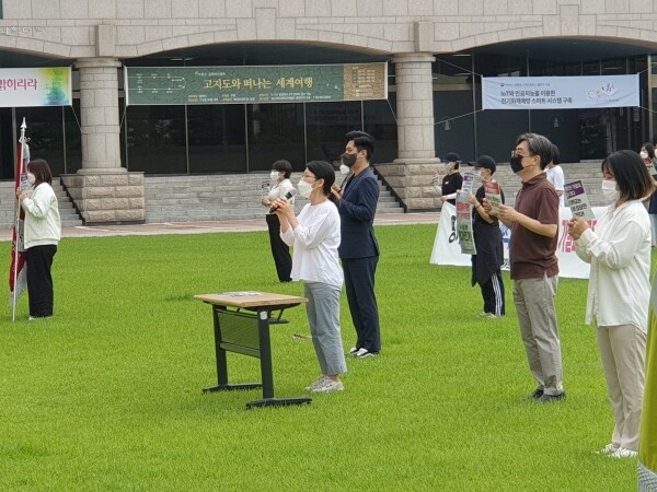 참가자들은 ‘낙인찍기 대학 기본역량 진단, 교육부는 평가방식 개편하라!’, ‘평가기준 공개 않는 대학기본역량진단평가 가결과 규탄한다!’, ‘오락가락 일관성 없는 교육부 평가 이의신청 수용하라!’ 등의 문구가 적힌 플래카드와 피켓을 들고 구호를 외쳤다.