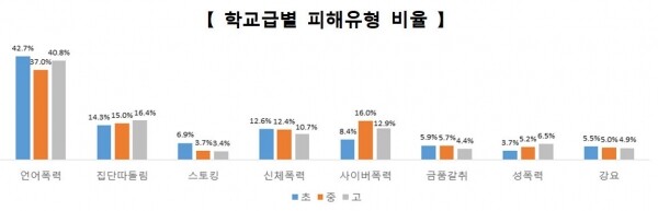 초등학교는 언어폭력이, 중학교는 사이버폭력의 응답 비중이 가장 높았다. 특히 언어폭력의 경우 초등학교의 경우 42.7%로 나타나 중학교 37.0%, 고등학교 40.8% 보다도 높은 것으로 나타났다.