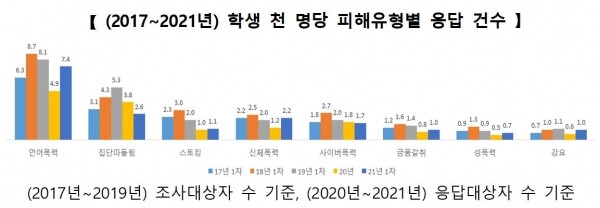 학생 천명당 피해유형 응답건수는 2020년 조사와 비교해 언어폭력과 신체폭력이 증가한 것으로 나타났다. 언어폭력은 2.5명, 신체폭력은 1.0명 늘었다. 반면 집단따돌림, 사이버폭력은 각각 1.2명, 0.1명 감소했다.