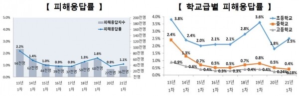 학교급별로는 초등학교 2.5%, 중학교 0.4%, 고등학교 0.2%로 조사돼, 2020년 조사 대비 초등학교가 0.7%p 증가한 것으로 나타났다. 중학교는 0.1%p, 고등학교는 0.06%p 감소했다.