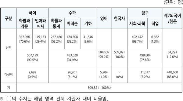 영역별로는 전체 지원자 50만9821명 중 국어영역은 50만7129명(99.5%), 수학영역은 48만3620명(94.9%), 영어영역은 50만4537명(99.0%), 한국사영역은 50만9821명(100%), 탐구영역은 49만8804명(97.8%), 제2외국어/한문영역은 6만1221명(12.0%)이다.