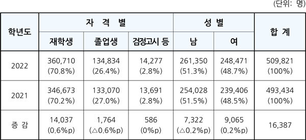 성별로는 남학생이 전년 대비 7322명 늘어난 26만1350명(51.3%), 여학생은 9065명 증가한 24만8471명(48.7%)으로 각각 집계됐다.