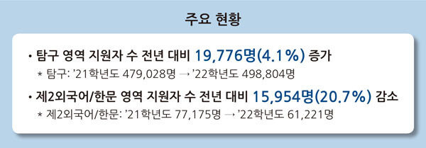탐구영역 지원자 49만8804명 중 사회·과학탐구영역 선택자는 49만2442명(98.7%), 직업탐구 영역 선택자는 6362명(1.3%)이었으며, 탐구영역에서 선택 가능한 최대 과목수인 2과목을 선택한 지원자가 49만6247명으로 탐구영역 선택자(498,804명)의 99.5%를 차지했다.