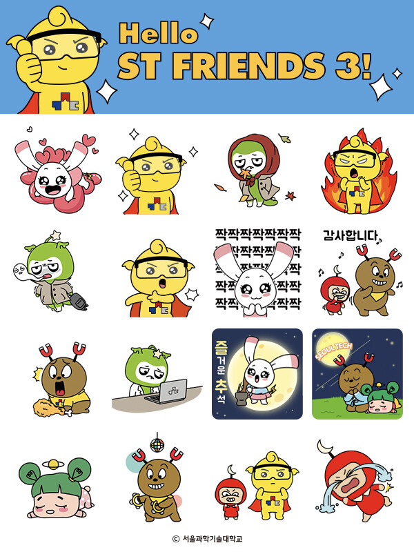 [대학저널 백두산 기자] 서울과학기술대학교(총장 이동훈, 이하 서울과기대)는 지난 6일 자체 제작 캐릭터인 ‘ST Friends(이하 에스티프렌즈)’의 세 번째 카카오톡 이모티콘을 무료 나눔했다고 9일 밝혔다.