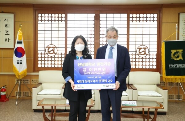 [대학저널 오혜민 기자] 전남대학교(총장 정성택)는 권귀염 유아교육과 교수가 최근 대학에 재직한 지 10년을 기념하기 위해 대학발전기금 2000만 원을 기부했다고 10일 밝혔다.