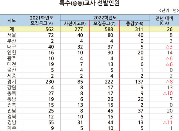 특수교사는 전년(562명) 대비 26명 늘어난 588명을 선발한다. 경남이 11명, 충북 10명, 경기 8명, 광주‧대전 6명, 대구 3명이 줄었다.
