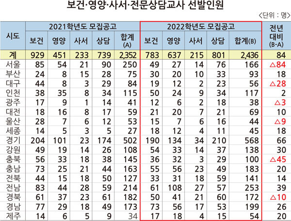 보건‧영양‧사서‧전문상담 교사는 2436명을 선발한다. 이는 전년 대비 84명 늘어난 것이다. 지난해 보건교사를 확대 선발한 여파로 올해 보건교사 선발인원은 전년대비 146명 줄어든 783명을 선발한다.