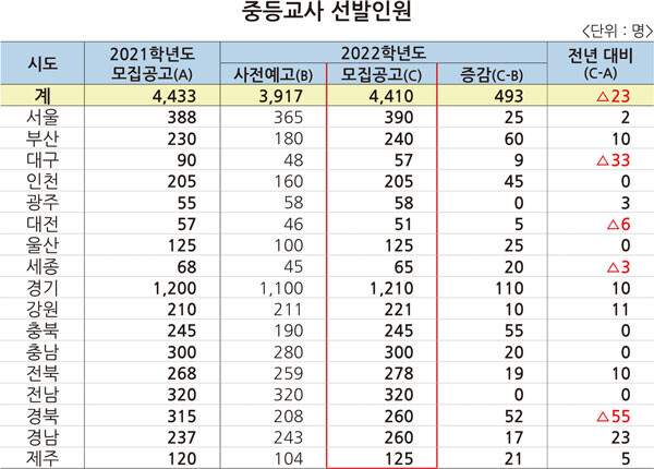 중등 교사 선발인원을 시·도별로 보면 ▲서울 390명 ▲부산 240명 ▲대구 57명 ▲인천 205명 ▲광주 58명 ▲대전 51명 ▲울산 125명 ▲세종 65명 ▲경기 1210명 ▲강원 221명 ▲충북 245명 ▲충남 300명 ▲전북 278명 ▲전남 320명 ▲경북 260명 ▲경남 260명 ▲제주 125명이다.