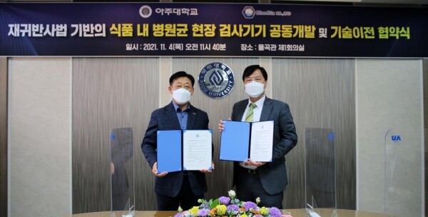 11일 아주대에 따르면 김재호·윤현철 응용화학생명공학과·대학원 분자과학기술학과 교수팀은 지난 4일 ‘재귀반사법 기반의 식품 내 병원균 현장 신속 검사’ 원천기술을 블루비즈에 기술이전했다.
