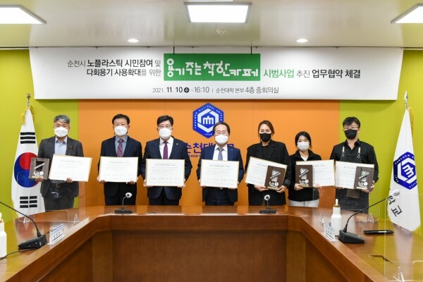[대학저널 오혜민 기자] 순천대학교(총장 고영진)는 지난 10일 캠퍼스에 입점한 카페 4곳과 순천시, 순천시 지속가능발전협의회, 순천YMCA 등과 ‘노플라스틱 카페 시범운영’을 위한 업무협약을 체결했다고 11일 밝혔다.