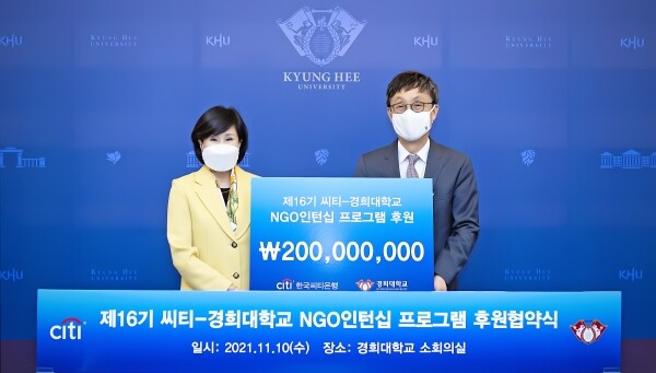 [대학저널 백두산 기자] 경희대학교(총장 한균태)는 공공대학원이 한국씨티은행(은행장 유명순)과 지난 10일 경희대 서울캠퍼스 본관에서 ‘제16기 씨티-경희대학교 NGO 인턴십 프로그램 후원 협약식’을 개최했다고 15일 밝혔다.