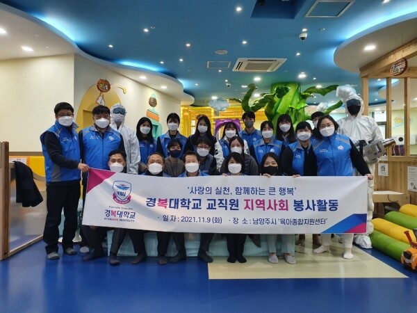 [대학저널 백두산 기자] 경복대학교는 교직원봉사단이 지난 9일 남양주시육아종합지원센터를 찾아 사회봉사활동을 실시했다고 16일 밝혔다. 이날 봉사활동에는 김경복 총장직무대행과 교직원봉사단원 등 18명이 참여했다.