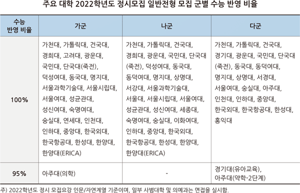 또한 서울대가 정시모집 가군에서 나군으로 모집 군을 변경함에 따라 고려대, 연세대 등 연쇄적으로 모집 군을 이동한 대학 및 모집단위가 있고, 동국대는 지난해까지 가/나군에서만 선발했으나 올해는 가/나군뿐만 아니라 신설한 AI융합학부가 다군에서 신입생을 선발한다. 이렇듯 모집 군 변화 또한 정확하게 확인해야 한다.