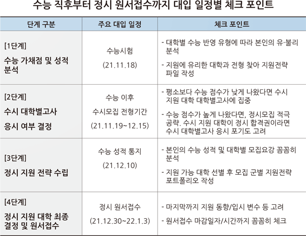 [대학저널 백두산 기자] 오는 18일 실시되는 2022학년도 대학수학능력시험이 끝나면 수시모집 대학별고사와 수능 성적 발표, 정시 원서접수 등 2022학년도 대입 전형이 본격화된다. 수험생들은 급박하게 돌아가는 일정에 수동적으로 대응하기보다는 합격을 위한 전략을 미리 세워놓고 능동적으로 대처해야 한다. 대입 전형 일정에 따라 수험생이 해야 할 일도 다른 만큼 수능시험 직후부터 일정에 따른 계획을 세우고 움직이는 것이 좋다. 남윤곤 메가스터디교육 입시전략연구소장의 도움을 받아 수능 직후부터 정시 원서접수 전까지 주요 대입 일정을 4단계로 나눠 수험생들이 알아야 할 체크 포인트와 유의사항 등을 정리했다.