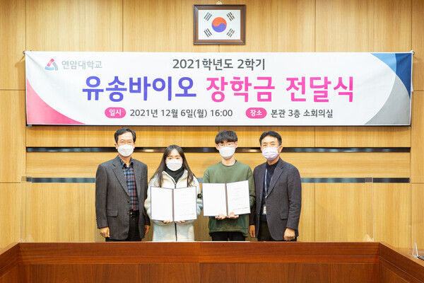 [대학저널 황혜원 기자] 연암대학교(총장 육근열)는 지난 6일 후배 영농인재 양성을 위해 김은집 교수가 출원한 ‘유송바이오 장학금’ 전달식을 가졌다고 7일 밝혔다.