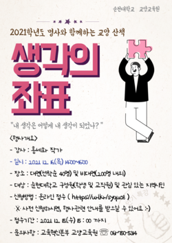 순천대 교양교육원 관계자는 “미래사회의 다각적 변화에 효과적으로 대응하고, 우리사회의 다양한 요구에 적응할 수 있는 능력 배양을 위한 가치관과 지식을 제공하고자 다양한 강연을 준비할 예정”이라고 말했다.