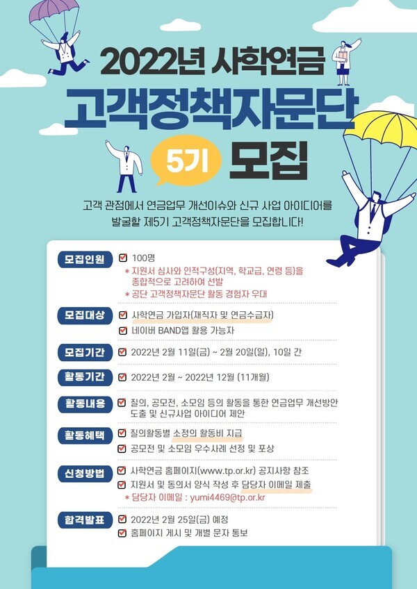 [대학저널 황혜원 기자] 사립학교교직원연금공단은 연금제도 운영과 정책 의사결정에 고객의 목소리를 반영하기 위해 제5기 고객정책자문단을 모집한다고 14일 밝혔다.