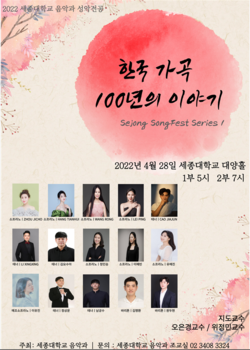 세종대는 음악과 성악전공 학생과 대학원생 15명이 오는 28일 세종대 대양홀에서 ‘한국 가곡 100년의 이야기’ 연주회를 개최한다고 24일 밝혔다.