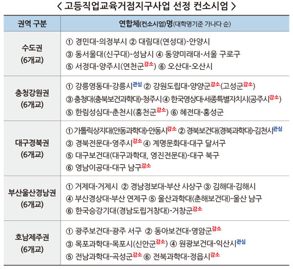 [대학저널 최창식 기자] 교육부와 한국연구재단은 2일 고등직업교육거점지구 사업(이하 거점지구 사업)에 선정된 5개 권역 30개 전문대학 컨소시엄을 발표했다.