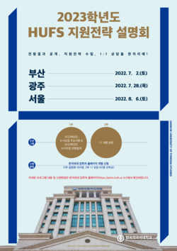 [대학저널 오혜민 기자] 한국외국어대학교 입학처가 7월 2일 경상권을 시작으로 ‘2023학년도 HUFS 지원전략 설명회’를 연다.