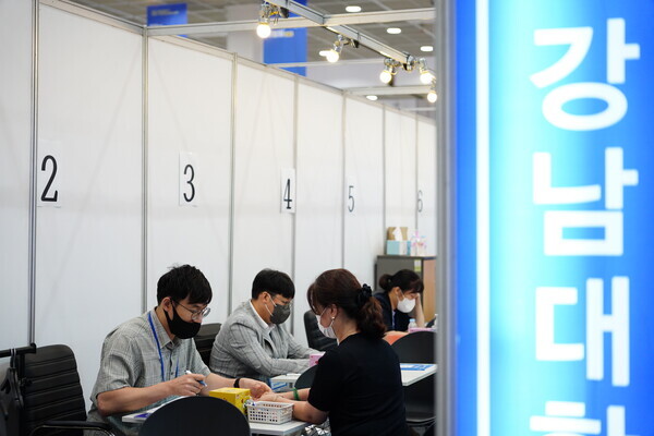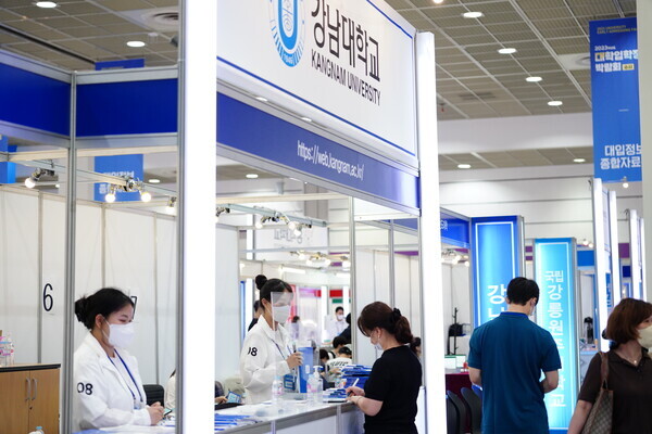 [대학저널 황혜원 기자] 한국대학교육협의회가 주최하는 '2023학년도 수시 입학정보박람회'(이하 수시박람회)가 20일부터 23일까지 서울 삼성동 코엑스에서 열린다. 이번 수시박람회에는 전국 149개 대학이 참가한다. 현재 수험생들이 대학부스에서 입시 상담을 진행하고 있다. 사진은 강남대 상담부스 모습.