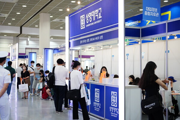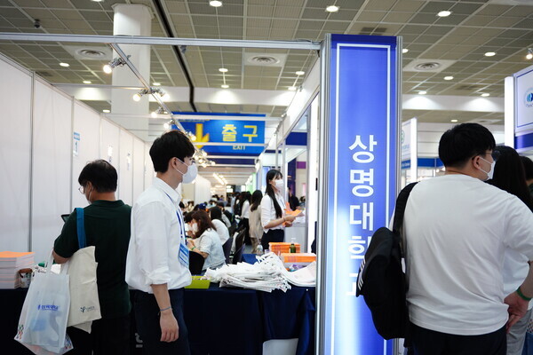 [대학저널 황혜원 기자] 한국대학교육협의회가 주최하는 '2023학년도 수시 입학정보박람회'(이하 수시박람회)가 20일부터 23일까지 서울 삼성동 코엑스에서 열린다. 이번 수시박람회에는 전국 149개 대학이 참가한다. 현재 수험생들이 대학부스에서 입시 상담을 진행하고 있다. 사진은 상명대 상담부스 모습.
