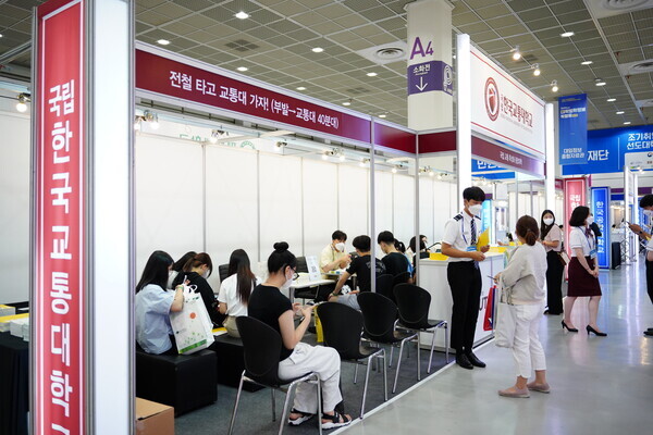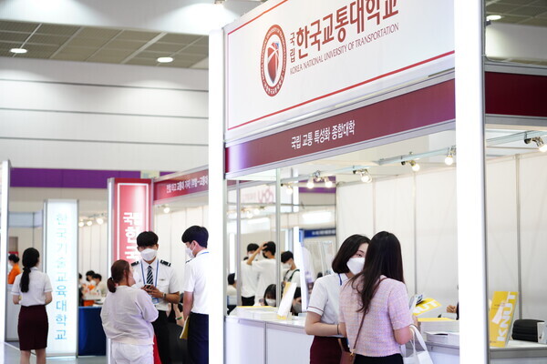 [대학저널 황혜원 기자] 한국대학교육협의회가 주최하는 '2023학년도 수시 입학정보박람회'(이하 수시박람회)가 20일부터 23일까지 서울 삼성동 코엑스에서 열린다. 이번 수시박람회에는 전국 149개 대학이 참가한다. 현재 수험생들이 대학부스에서 입시 상담을 진행하고 있다. 사진은 한국교통대 상담부스 모습.