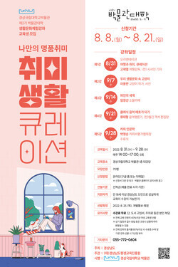 교육생은 50~70명을 선착순으로 모집한다. 교육비는 무료이며, 18세 이상 경남도민이면 누구나 참여할 수 있다. 취미생활 큐레이션은 오는 8월 8~21일, 경남건축문화탐방은 9월에 공지한 후 각각 모집할 계획이다.