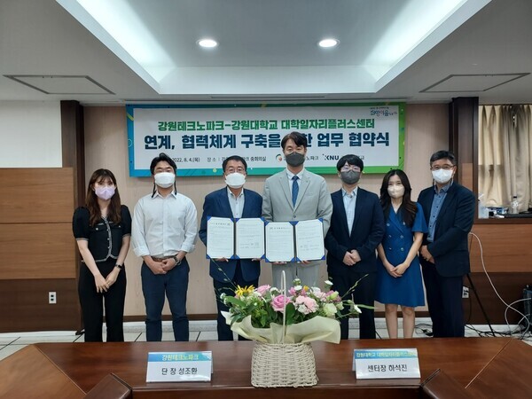 [대학저널 오혜민 기자] 강원대학교는 대학일자리플러스센터가 지난 4일 강원도일자리재단, 강원도인적자원개발위원회, 강원테크노파크 등 강원도 청년취업 지원 공공기관 3곳과 지역청년 역량강화를 위한 업무협약을 각각 체결했다고 5일 밝혔다.