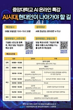 이번 특강은 중앙대 학생뿐 아니라 AI에 관심 있는 사람이면 누구나 수강할 수 있다. 사전 신청은 물론 당일 특강 사이트를 통한 참가신청도 받는다. 매 강연 주제마다 Q&A 시간이 10분 예정돼 있어 평소 궁금했던 질문에 대한 관련 전문가들의 답변도 들을 수 있다.