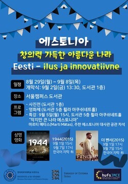 한국외국어대 스마트도서관 1층 문화공간에서 열리는 사진전을 시작으로 휠라아쿠쉬네트홀에서는 에스토니아에 대한 이해를 높일 수 있는 영화 두 편, '1944'와 ‘나의 펜싱 선생님(The Fencer)’이 기다리고 있다. 영화제는 '에스토니아 주간' 공식 개막식이 열리는 9월 2일과 7일, 오후 3시와 5시 두 차례 상영된다.