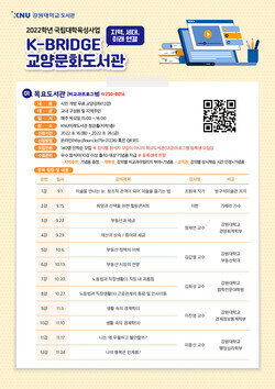 [대학저널 오혜민 기자] 강원대학교는 도서관이 9월 1일부터 KNU미래도서관 지하1층 정강홀에서 매주 목요일 오후 3시 K-Bridge 교양문화도서관을 운영한다고 31일 밝혔다.